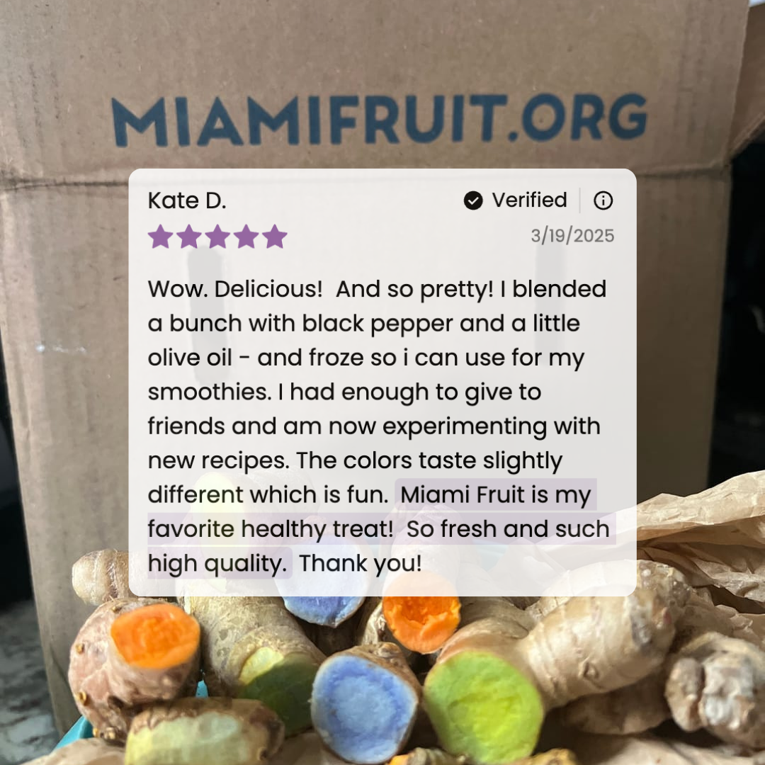 Our Rainbow Turmeric Box features a whopping seven different turmeric varieties: red(looks more like a dark orange than red), orange, yellow(sometimes looks orange), green(sometimes looks light blue or yellow), blue(sometimes looks purple), black(looks like a sky blue), and white turmeric.