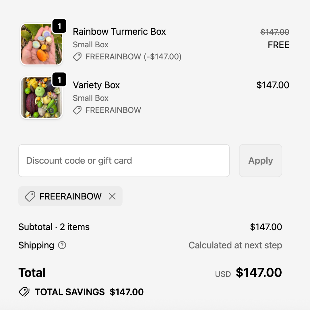 *be sure to include a Small Rainbow Turmeric Box in your cart for the code to work: