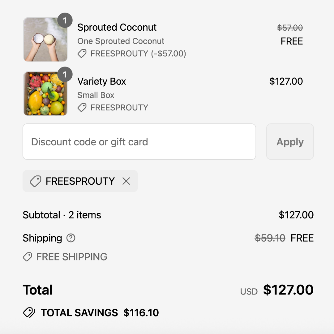 *To ensure that the code works, please make sure to add one sprouted coconut to your cart.