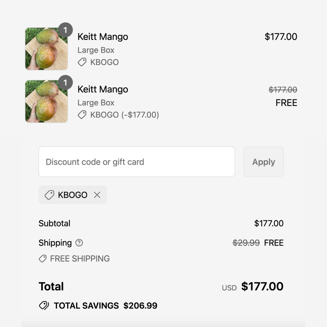 For a very limited time, buy any size Keitt Mango Box and get one of equal or lesser value FREE.