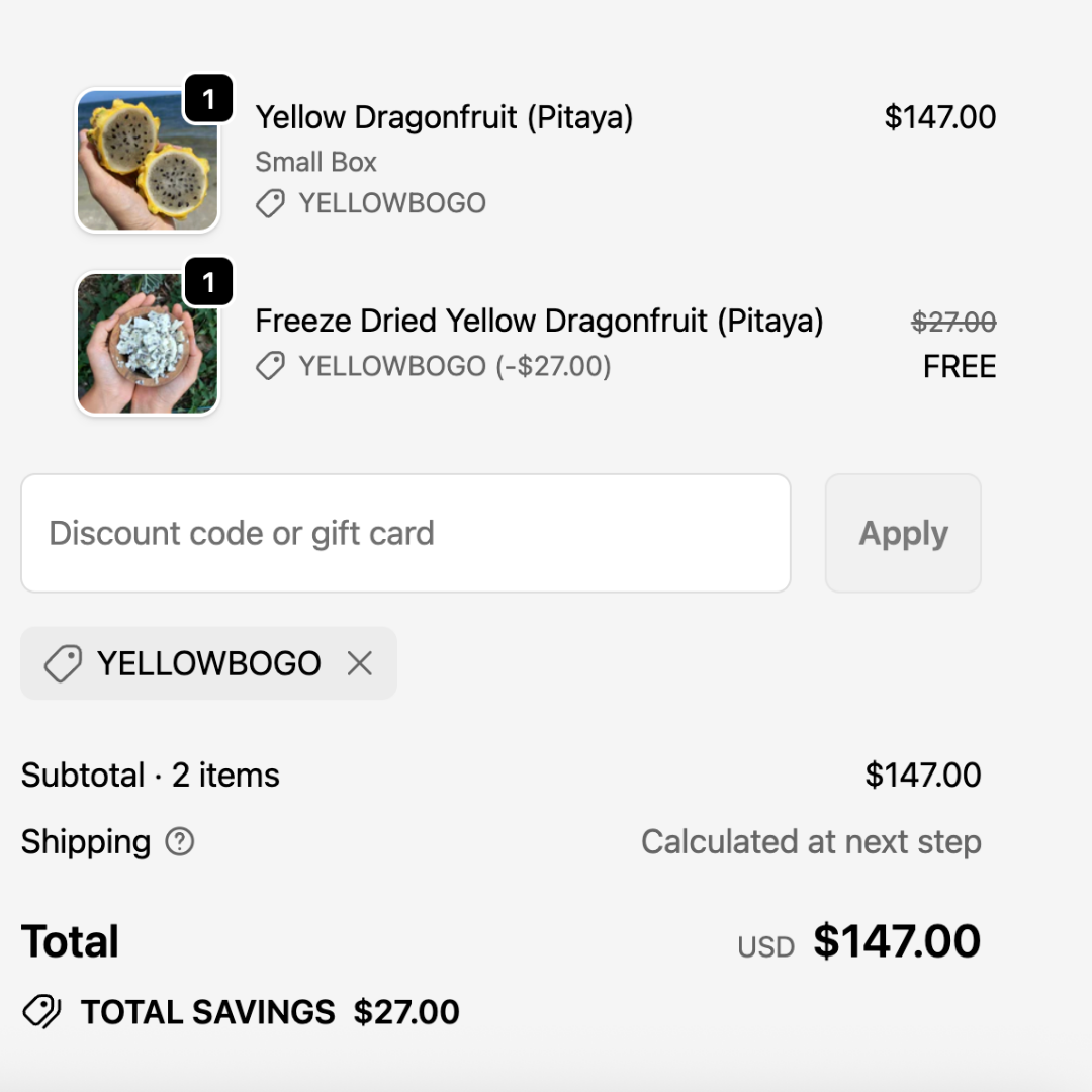 Use code: YELLOWBOGO at checkout to buy one Small or Large Yellow Dragonfruit box, and get a FREE Pack of Freeze Dried Yellow Dragonfruit!